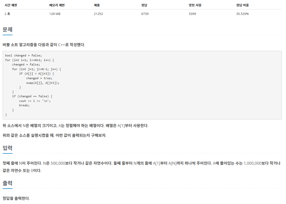 일단 처음에 문제를 정확히 이해를 못했었는데 여러 번 읽고 보니까 버블 정렬의 swap이 한 번도 일어나지 않은 루프가 언제인지 찾는 문제였다. 그래서 그냥 버블 정렬을 사용하면 되는거 아닌가? 라고 생각했으나 시간 제한 2초에 N의 최댓값은 500,000이기 때문에 시간초과로 풀 수 없고 다른 방법을 사용해야 했다.